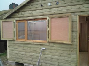 Finally, along with the double glazed windows we installed a stable door with a 5 lever Yale lock and designed heavy duty shutters to protect the windows when the beach hut is not being used. There are then two heavy-duty galvanised steel strips with studs which pass through the walls and are secured with wing nut bolts for speed from the inside.