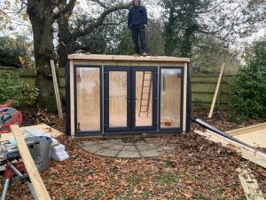 The roof is pitched (standard 2.5m to ridge although this is a higher version) insulated and comes with a ply ceiling, felt tile roof, underfelt and internal spot lights or light panels. Within the electrics pack there is consumer unit, 3 brushed stainless steel double sockets and a switch. We also install sockets with built in USB charging points which is very useful and this building also has external spots (not standard on the studio model) to light up the porch area.