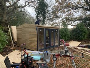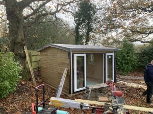 Garden Studio, Hampshire. This is a perfect little spot in the garden for a garden office. Mr M wanted an office to create a warm quite space to be able to concentrate on work and compared to London it is a great little commute, about 20 paces!