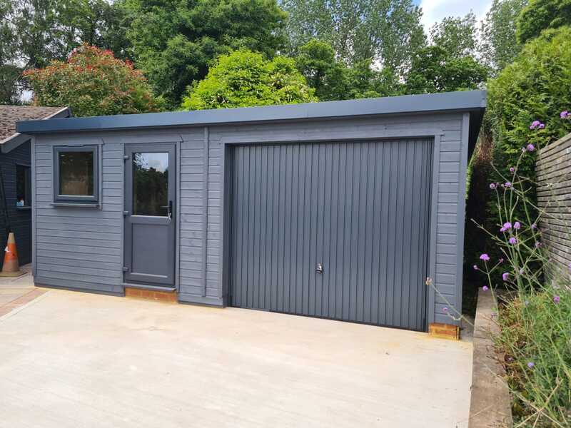 This timber garage comes with two sets of up and over doors and the garage also comes with guttering to the rear, either in black or brown with down pipes. In this case they have swapped one garage door for a door and window to create office space