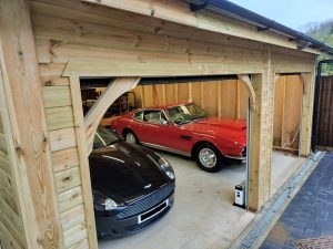 Wooden Garages, Dorset. Mr B contacted Garden Retreat requiring a double garage which we were pleased to design build and supply. As you can see it has some fantastic cars stored in the garage and wooden garages are great to store classic cars as they allow them to breath.