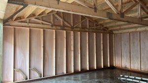 Our wooden garages are constructed using 100mm x 38mm timber framing clad with tanalith BS8417 shiplap, bitumen paper and 4mm plywood lining. This standard garage, has 300mm overhangs to front and rear with guttering and down pipes, the overhang to the rear is 150mm to the gable ends. The eaves height on this double garage with standard double doors is 2.3m plus the single engineering brick course, this allows the doors to miss the guttering if barn doors are installed.. The ridge height varies depending on the width of the garage but sits generally around 3.5 metres. We can manufacture the ridge height to be no higher than 2.5m if required to sit within the planning regulations.